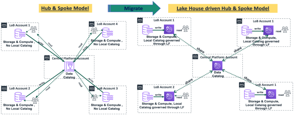 Since the current implementation of the hub and spoke model is very rigid and does not allow for flexible access grants (both inside and outside the account), we recommended that the next iteration relies on Lake Formation’s governance features to provide governance controls to manage access for data consumers that are internal and external to the account. With this approach, the flexibility of governance in Lake Formation will also seamlessly enable security teams to build comprehensive monitoring and observability solutions to further monitor the data access and address regulatory requirements.