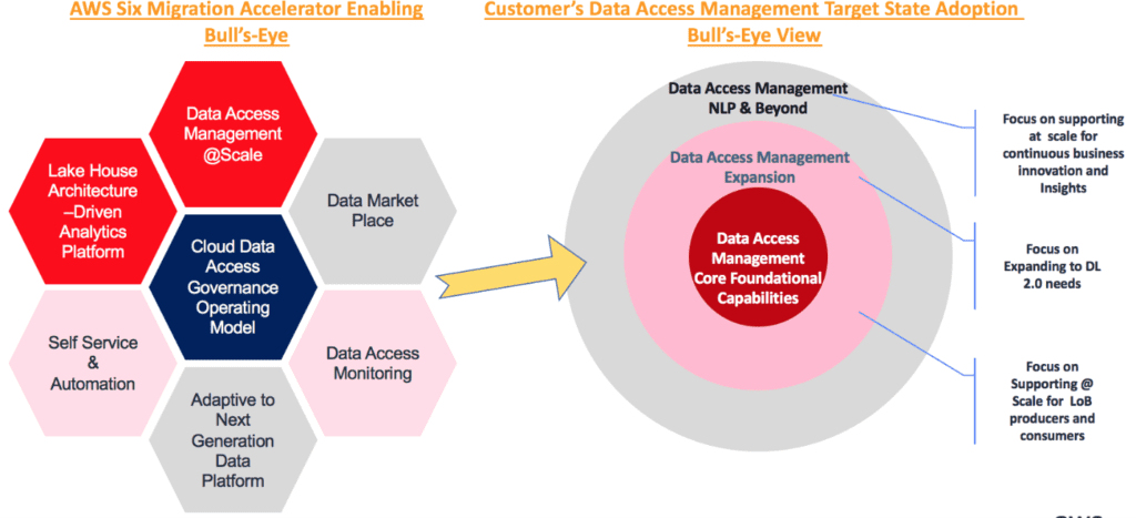 Since migrating to the AWS cloud over six years ago, the customer has utilized a hybrid-cloud approach. They have been using AWS for data and analytics while still leveraging some databases from their on-premises IBM Mainframe until their current migration efforts are complete. However, the current data access controls in place in their AWS environment are beginning to encounter hard security limits, security and governance best practices are being overlooked, and data consumers are struggling to discover, access, and collaborate within the current data landscape. These issues are not only slowing down the delivery of data and analytics projects but also putting the organization at risk of fines for failing to meet security regulations.