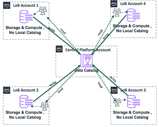 Within the AWS cloud, the customer currently has a decentralized data and analytics approach consisting of a variety of compute and storage solutions that are segregated within each line of business (LoB). Each LoB currently has its own set of AWS accounts spread across Software Data Lifecycle (SDLC) environments (Development, Test, Production). Across all LoB, there are approximately 100 accounts in total.